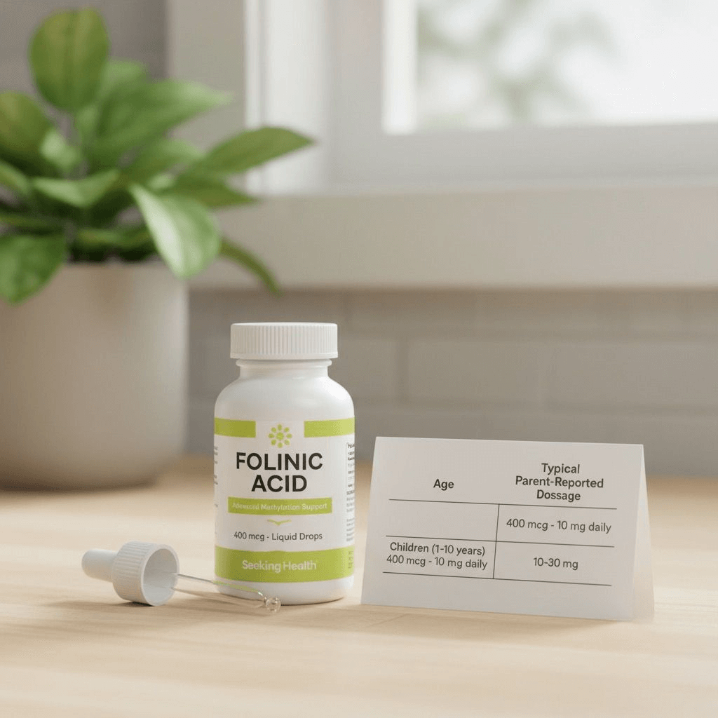 Folinic acid is the over-the-counter version of Leucovorin. It supports healthy methylation and brain energy. Parents report it helps with focus